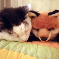Ubi loves to cuddle with his fox friend. He’s usually very camera shy, but sometimes I can get a shot when he’s sleeping.